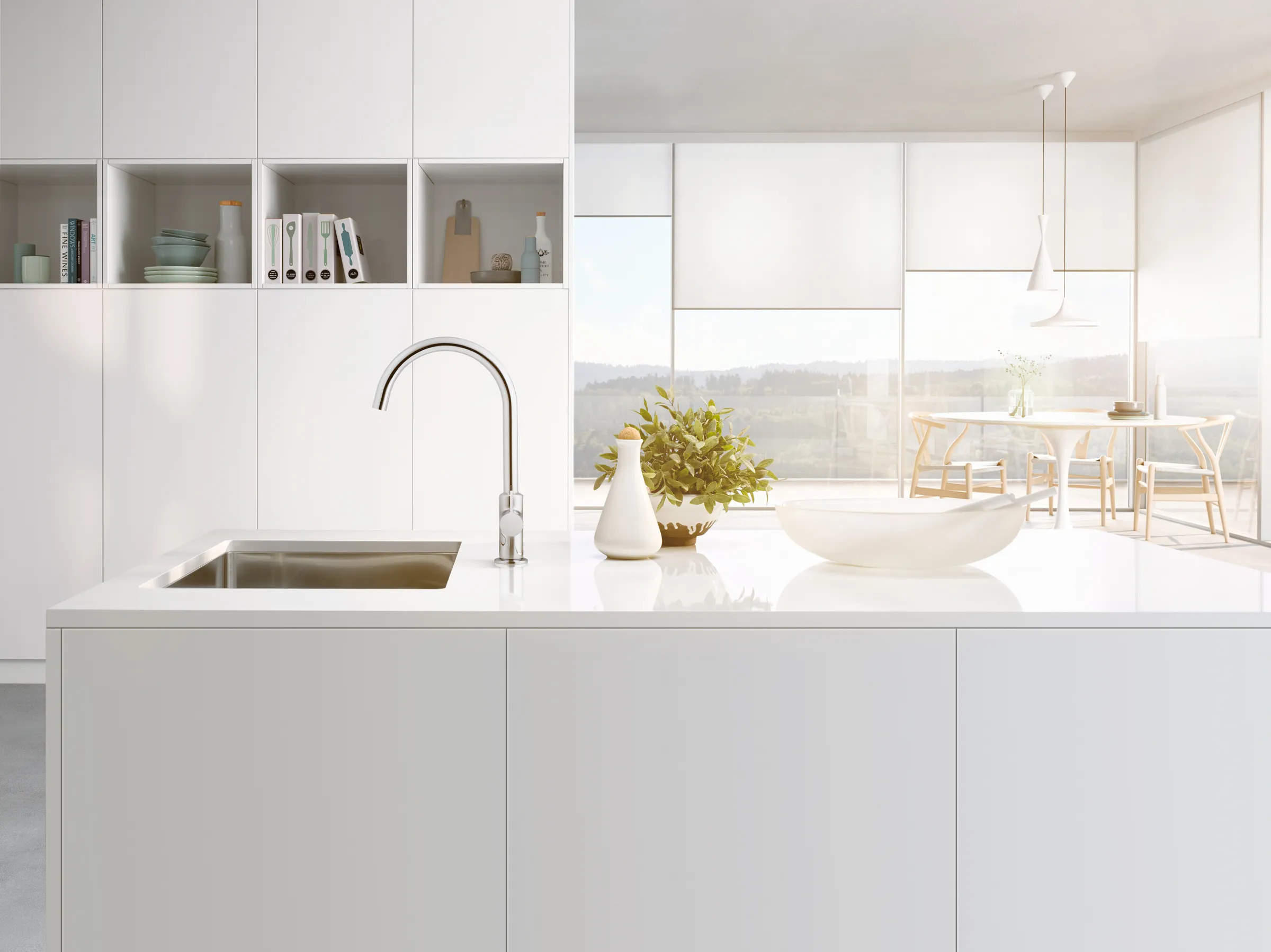 дополняющие целостность композиции элементы. Выдвижной излив, дополнительные варианты отделки смесителей матовым белым или черным цветом - это преимущества, которые по достоинству оценят люди, ставящие на функциональность и дизайн в кухонных интерьерах.
