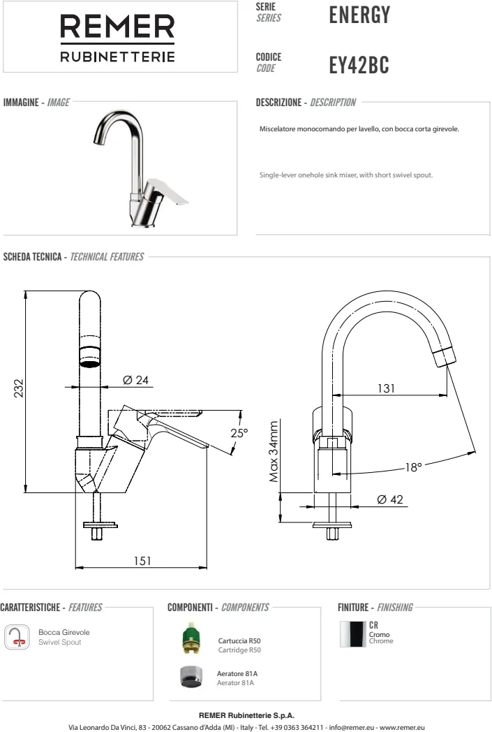 Смеситель для раковины Remer Energy хром EY42BC — это высококачественный однорычажный смеситель с высоким изогнутым поворотным изливом, идеальный для установки на кухонную раковину. Изделия бренда Remer Rubinetterie выделяются разнообразием стилей и форм, что позволяет легко подобрать модель, которая гармонично впишется в любой кухонный интерьер. Этот смеситель для умывальной раковины сочетает в себе современный дизайн и удобство использования, обеспечивая максимальный комфорт при эксплуатации. Смеситель имеет прочную конструкцию и изготовлен из высококачественных материалов, что гарантирует его долговечность.