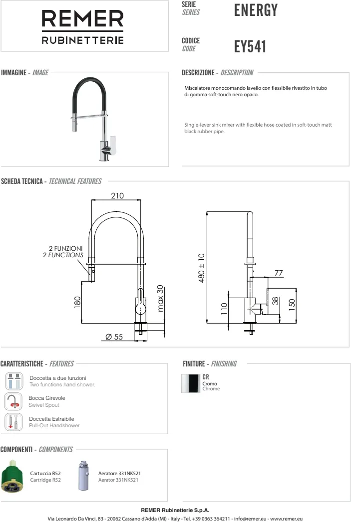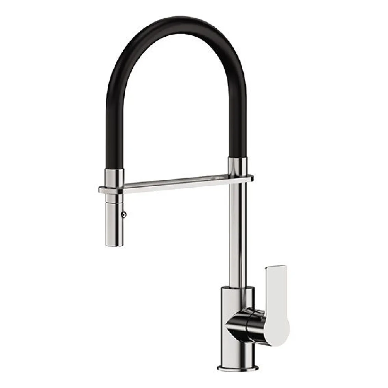 Элегантный однорычажный смеситель для кухни от Remer из коллекции Energy станет стильным дополнением любой современной кухни. Изделие выполнено из высококачественной латуни и покрыто мягкой на ощупь резиной в области ручного душа. Глянцевая хромированная поверхность придаёт изделию утончённый и изысканный вид, а также обеспечивает долговечность и простоту в уходе. Гибкий шланг покрыт матовой черной резиной soft-touch, что позволяет легко направлять струю воды, улучшая функциональность и удобство использования на кухне. Ручной душ оснащён двумя режимами, что делает кухонные работы более комфортными и эффективными. Поворотный излив и возможность монтажа на мойку позволяют разместить смеситель в удобной для вас позиции.