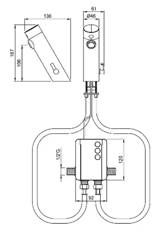 Инфракрасный лазерный датчик мгновенно реагирует на приближение рук, автоматически включая и выключая поток воды. Устройство питается от батареек или от сети 220 В через USB-подключение. В случае перебоев с электроснабжением смеситель продолжит работать от аккумулятора (6 В), что обеспечивает стабильность и надёжность в эксплуатации.