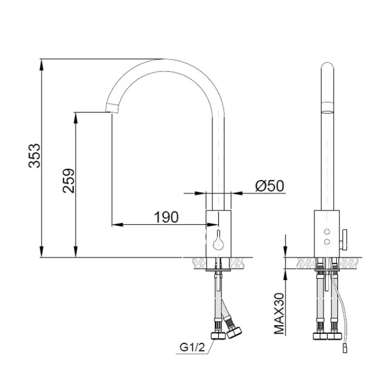 Кран активируется при приближении рук на расстояние от 12 до 18 см. Работа осуществляется от четырёх батареек типа AA (6 В) или от сети 220 В (через внешний модуль, не входит в комплект). Смеситель самостоятельно отключает поток воды, если пользователь убирает руки — это экономично и удобно.