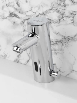 Автоматический смеситель для умывальника Установка на столешницу с автоматической системой активации через встроенный в нее инфракрасный датчик Кран работает от 4 батареек АА, которые обеспечивают напряжение 6 В, или может быть подключен к электрической сети с помощью модуля ( включен в комплект) (220 В, 50/60 Гц). Расход 6 л / мин при давлении 3 бара Материал: хромированная латунь CW617N Размеры: 159 высота x 69 ширина x 133 глубина (мм)