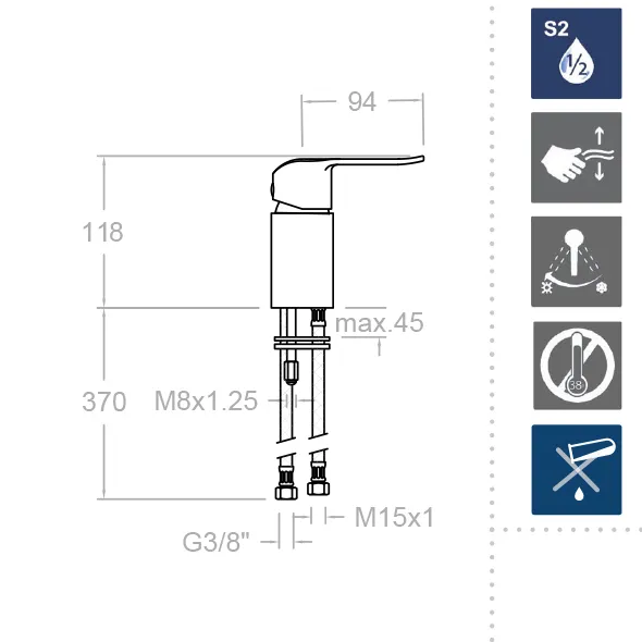 Оптимальное рабочее давление для смесителя составляет от 1 до 5 бар, при рекомендуемом уровне – 3 бара. Поддерживаемая температура горячей воды — до 55 °C с возможностью кратковременного увеличения до 90 °C. Высокое качество материалов и технологий обеспечивает долговечную службу и бесперебойную работу.