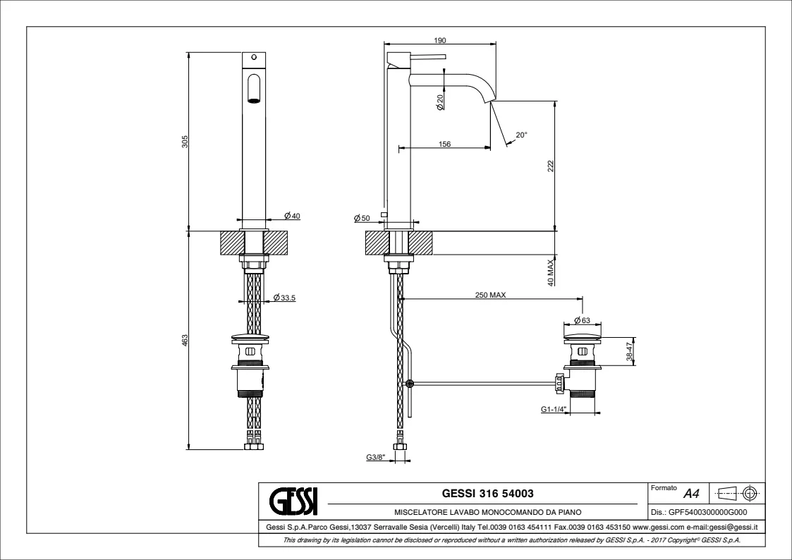Смеситель однорычажный для раковины Gessi 316 Flessa 54003.707 в цвете черный металл с матовым покрытием pvd, с донным клапаном.