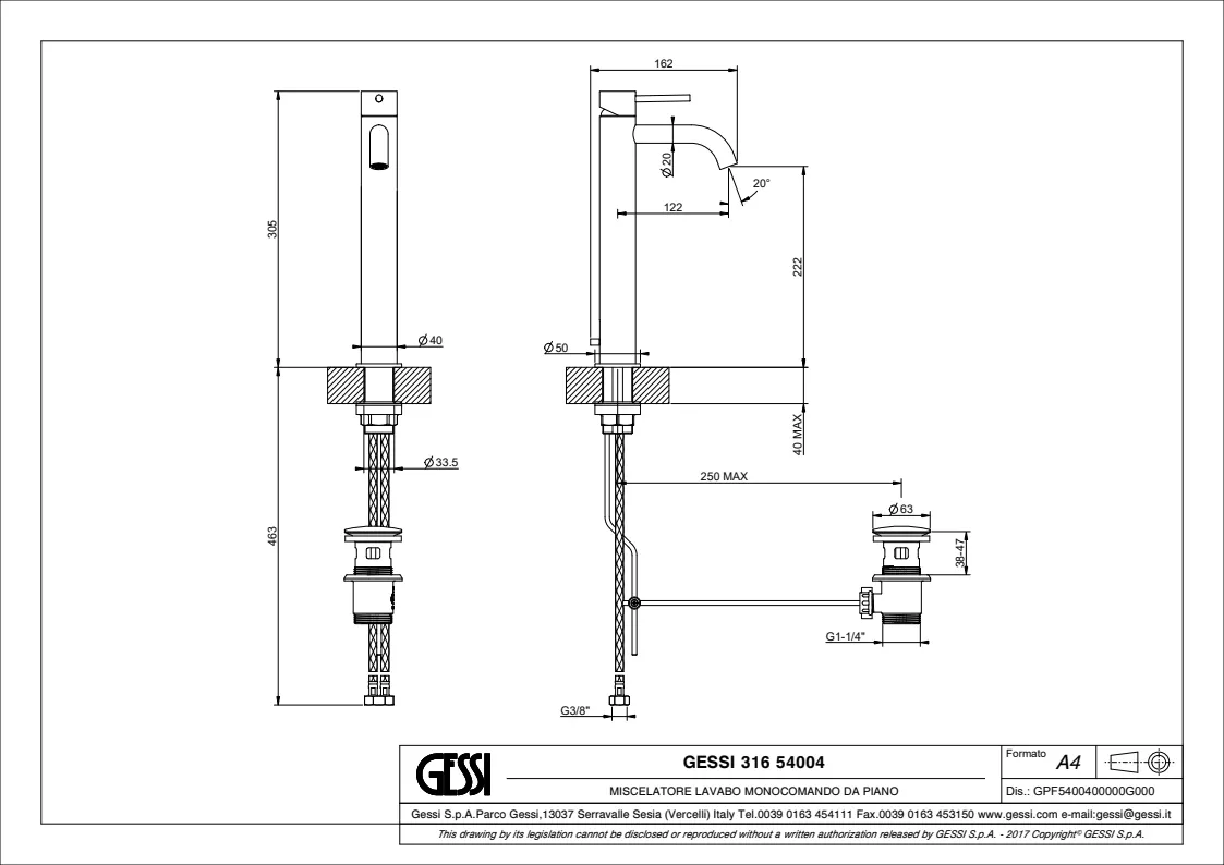Смеситель однорычажный для раковины Gessi 316 Flessa 54004.707 в цвете черный металл с матовым покрытием pvd, с донным клапаном.