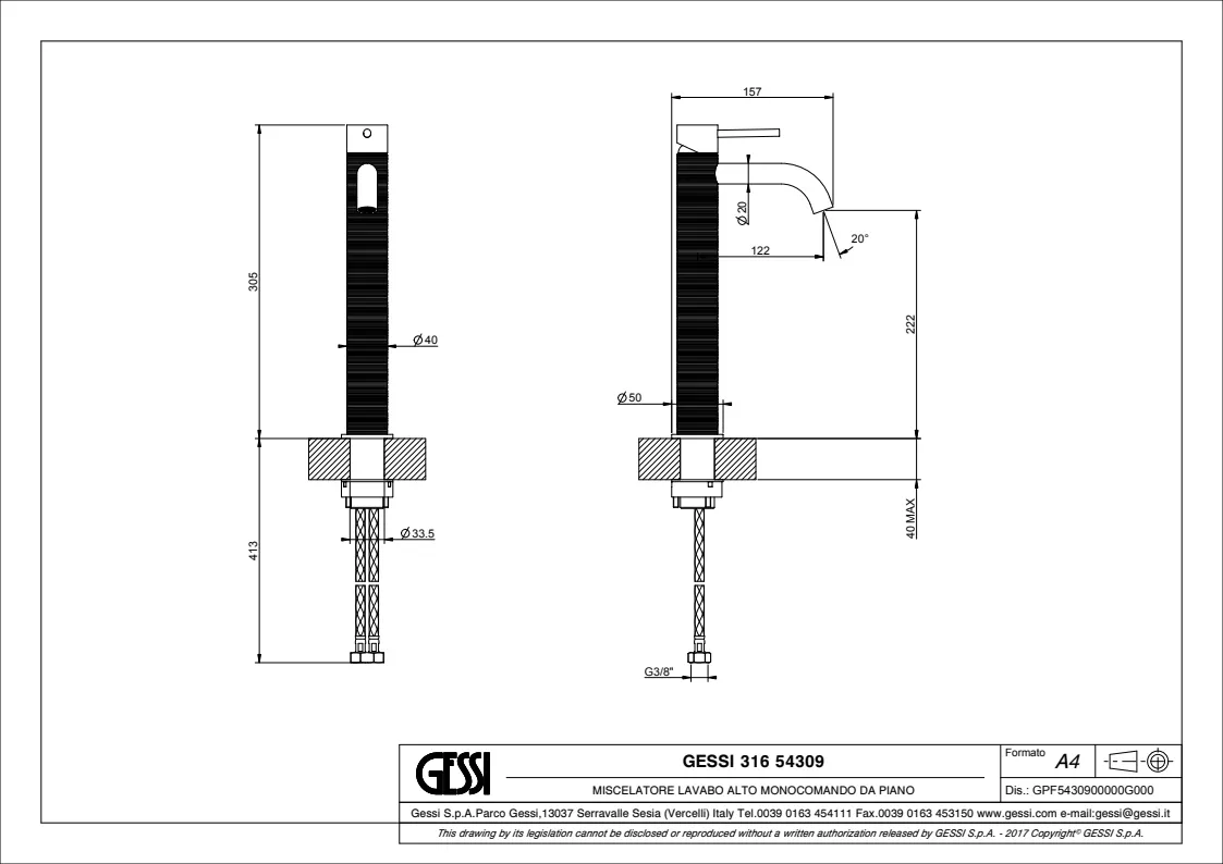 Смеситель однорычажный для раковины Gessi 316 Trame 54309.707 в цвете черный металл с матовым покрытием pvd.