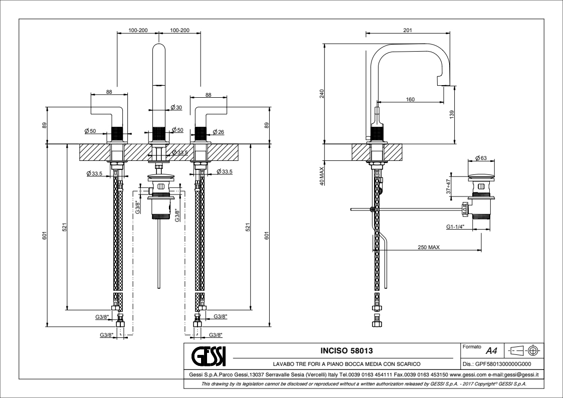 Смеситель для раковины Gessi Inciso 58013.246 в цвете золотой Pvd.