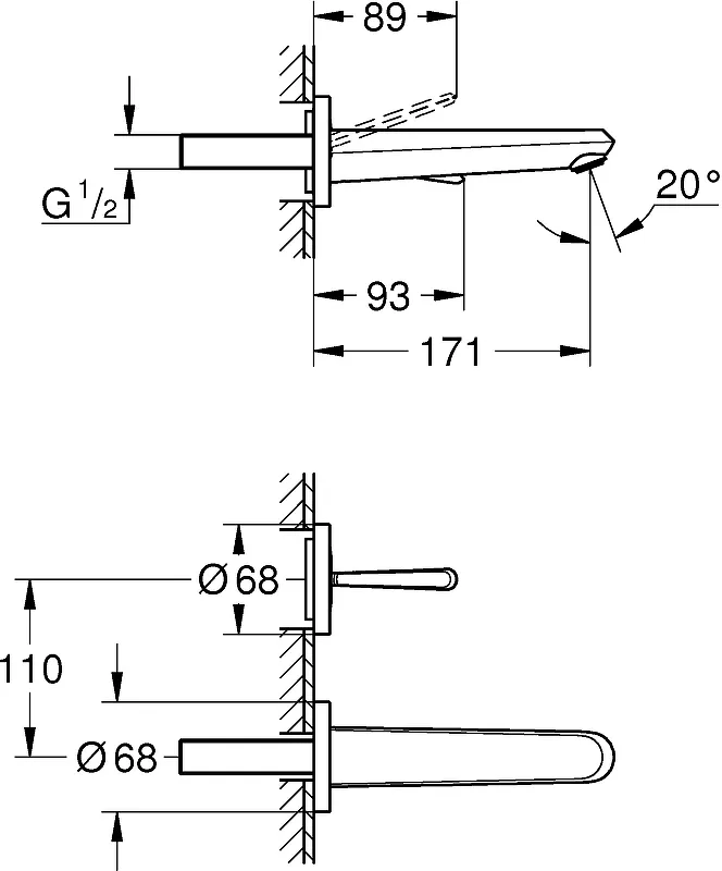 Настенные смесители (wall-mounted) — идеальны, когда раковина стоит отдельно без крепления на мебель, либо когда монтаж на столешницу нежелателен. В ассортименте Grohe Allure, Veris и Atrio есть модели настенного монтажа.