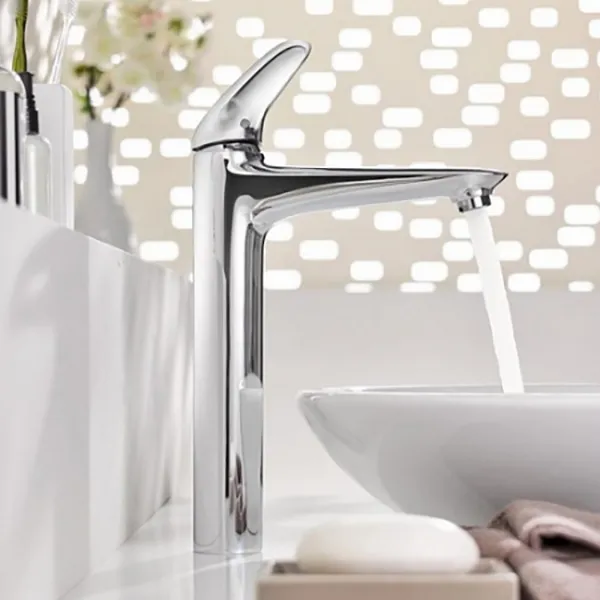 • Высокие вытяжные (XL или L-Size) смесители, например в линейке Plus и Essence — отлично подходят для накладных и напольных раковин, когда нужен высокий излив.