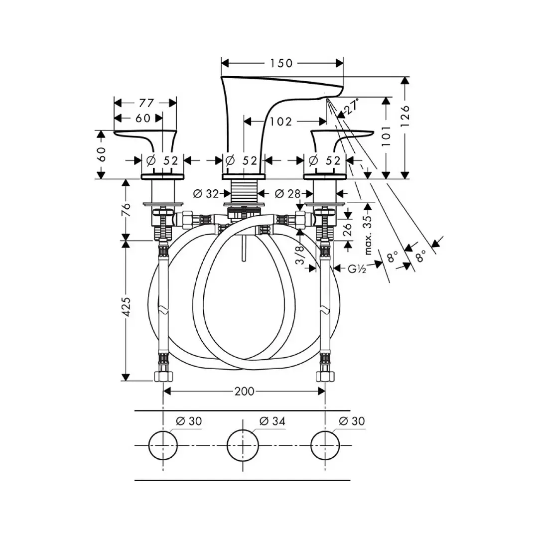 Смеситель для раковины на 3 отверстия, 20*15*h12.6,, хром