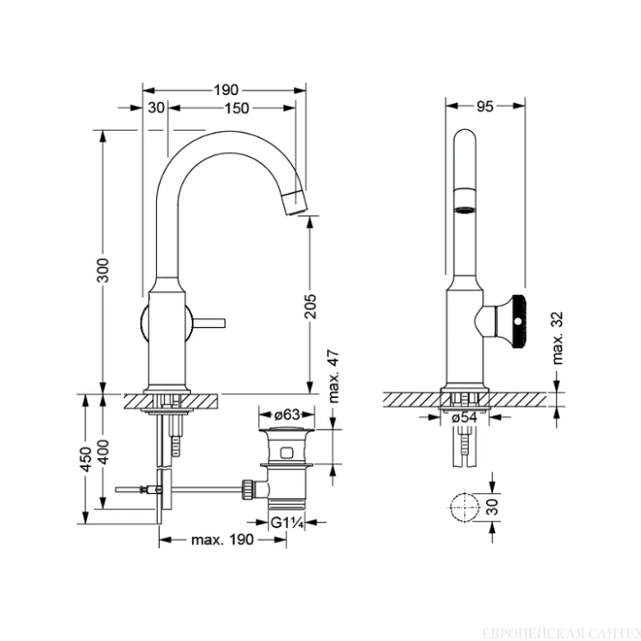 Joerger Valencia Смеситель для раковины, высота 30 см, однорычажный, на 1 отверстие. Поворотный излив 150 мм, аэратор M22 x 1, керамический картридж ½“. Донный клапан со штангой 1 ¼“, 2 медные трубки M10x1 x 40 см. цвет хром/аметист.
