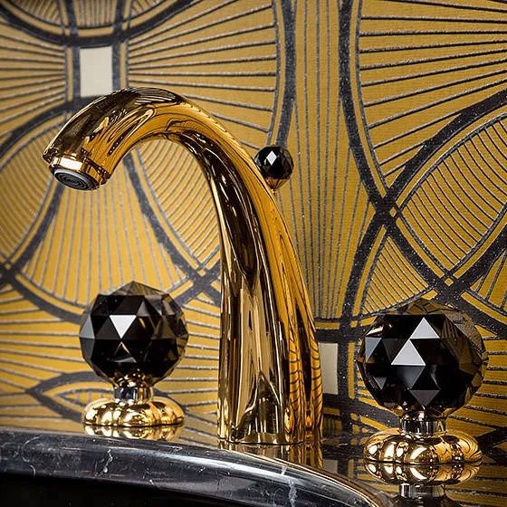 Смеситель для раковины Jorger Florale Crystal является истинным произведением дизайнерского искусства, сочетая в себе не только функциональность, но и выдающийся стиль. Этот двухрычажный смеситель, изготовленный из высококачественного металла с золотым покрытием, дополнен ручками из черного хрусталя, что придает ему особенно роскошный вид. Золотой цвет корпуса смесителя в сочетании с темными хрустальными акцентами создает контрастное и в то же время изысканное сочетание, делая его выразительным элементом любой ванной комнаты.