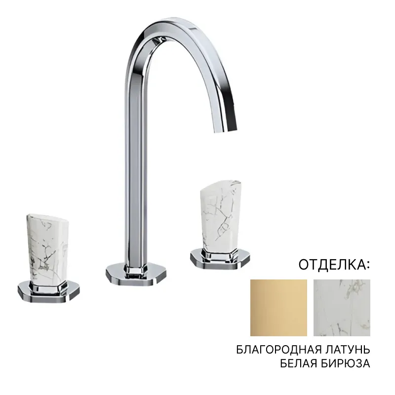 Финишное покрытие выполнено в благородной латуни, а ручки оформлены с элементами из белой бирюзы, что придаёт смесителю утончённый и выразительный облик. Этот смеситель прекрасно сочетается с интерьерами, где используются элементы классики, ар-деко и модерна, внося в пространство нотки элегантности и роскоши. Мягкие формы и тщательно продуманные детали подчёркивают гармоничное сочетание материалов и дизайна.