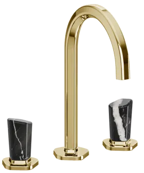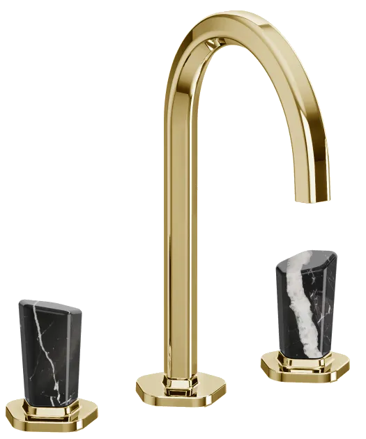 Золотой цвет добавляет ванной комнате или кухне нотку роскоши, в то время как черный мрамор на ручках подчеркивает элегантность и утонченность. Этот смеситель гармонично впишется в интерьеры, оформленные в классическом, современном или арт-деко стиле, становясь ярким акцентом и дополнением к общей атмосфере помещения.