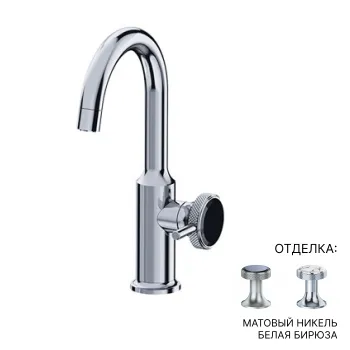 Высота смесителя составляет 300 мм, а вынос носика равен 150 мм, что обеспечивает оптимальное расстояние для комфортного использования. Отделка смесителя в матовом никеле придает ему современный и стильный вид, а белая бирюзовая ручка добавляет в интерьер нотки свежести и яркости.