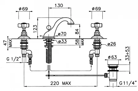 Nicolazzi El Capitan 1408CR69 - двухвентильный смеситель для раковины с автоматическим сливом, на 3 отверстия, в комплекте с ручкой EL CAPITAN 69, с донным клапаном, тип регулирования воды-керамический картридж, цвет - хром.