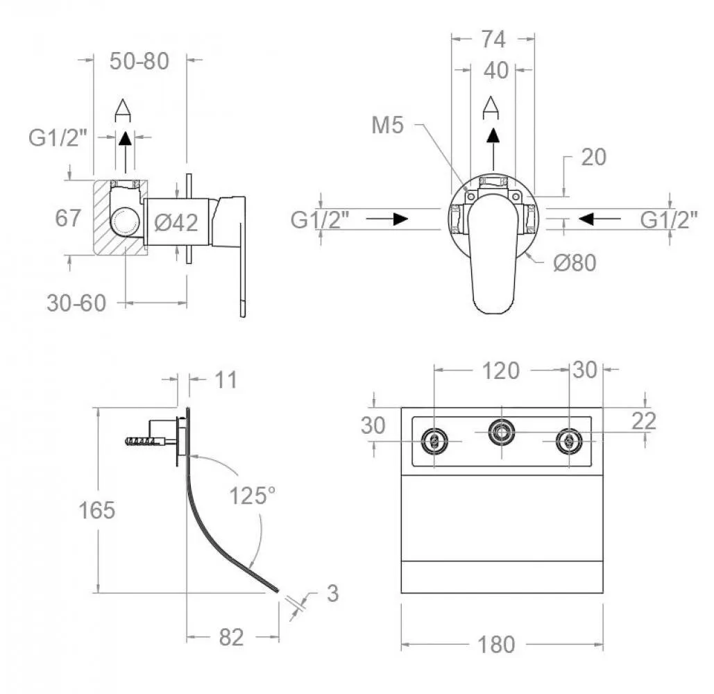 Смеситель для раковины Ramonsoler Alexia встраиваемый с каскадным изливом графит 3616902GR