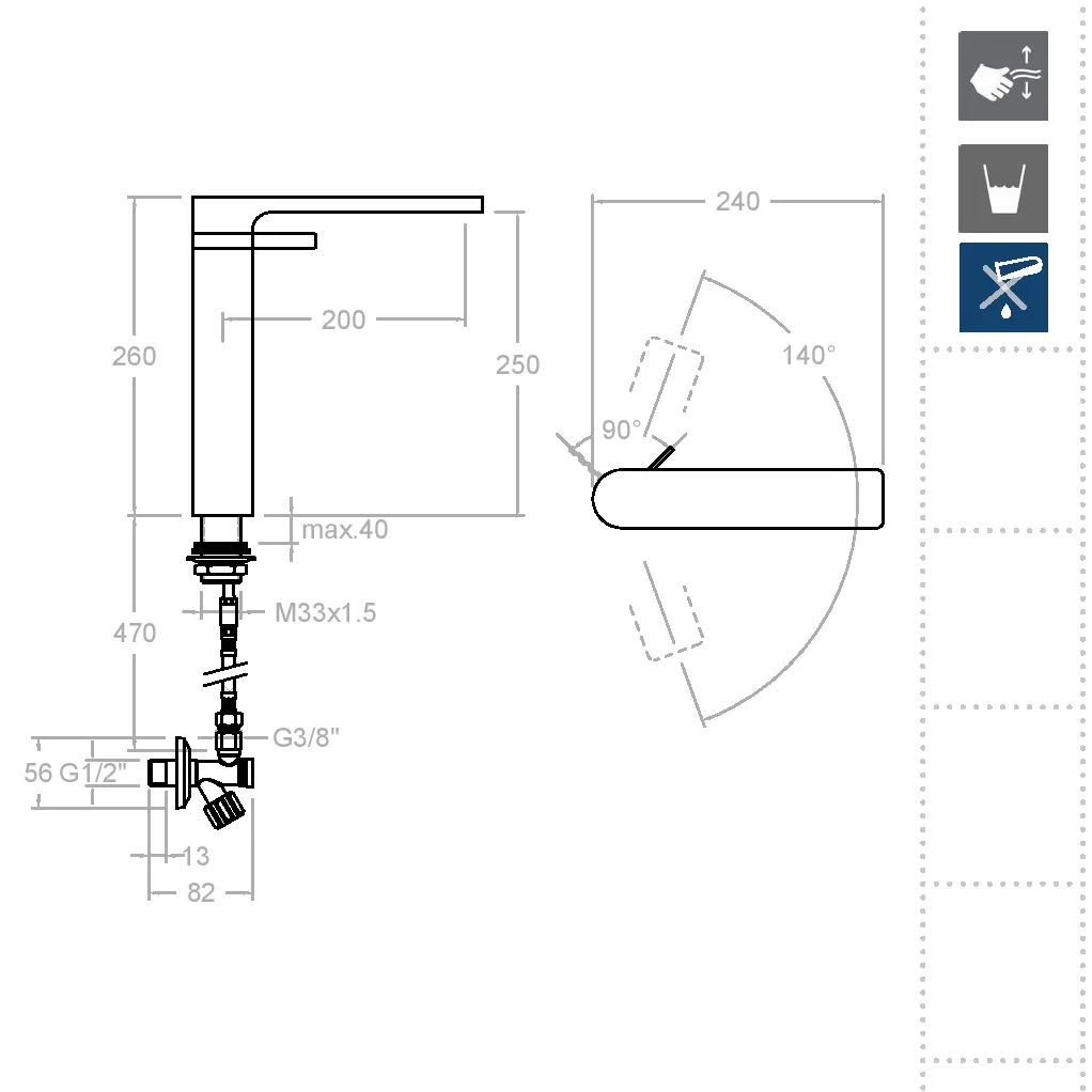 Однорычажная конструкция смесителя с поворотным изливом на 140° разработана для вашего комфорта. Удобная ручка расположена под изливом, что делает использование интуитивно понятным. Высота модели составляет 260 мм, обеспечивая оптимальное пространство для любых нужд.