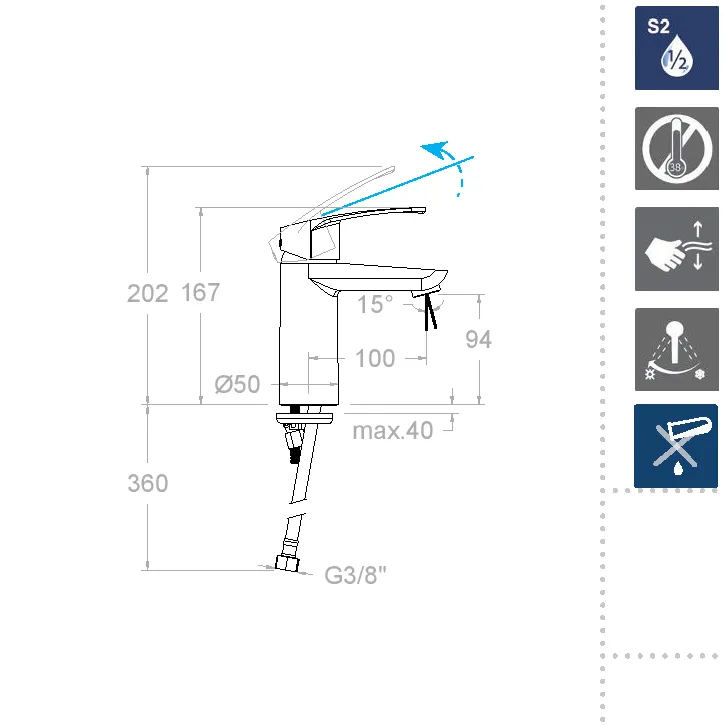 - Водосберегающая система S2 способствует снижению расхода воды при давлении в системе от 11 до 12 литров в минуту;