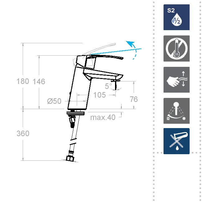 Система двойного открытия S2 помогает экономить до 50% воды без потери комфорта. Первое положение ручки позволяет экономично использовать воду, а для полного открытия необходимо преодолеть лёгкое сопротивление.