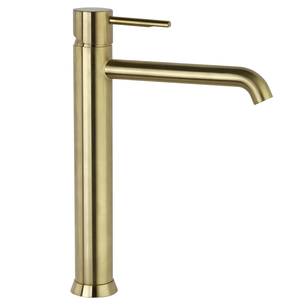 Смеситель выполнен из высококачественной латуни, что обеспечивает его долговечность. Высота составляет 293 мм, а длина излива — 180 мм, что делает его идеальным выбором для накладных раковин.