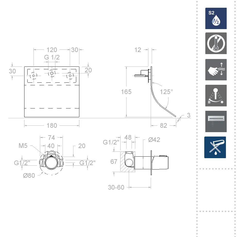 - Экономия и безопасность: Встроенная система Thermostop Block ограничивает максимальную температуру горячей воды, предотвращая случайные ожоги. Система экономии воды S2 позволяет открывать ручку смесителя в два этапа, снижая расход при 3 барах до 11 л/мин.