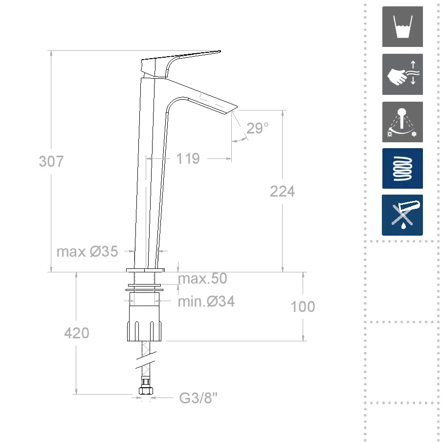 - Высота смесителя составляет 307 мм, что делает его идеальным для установки в стильные интерьеры.