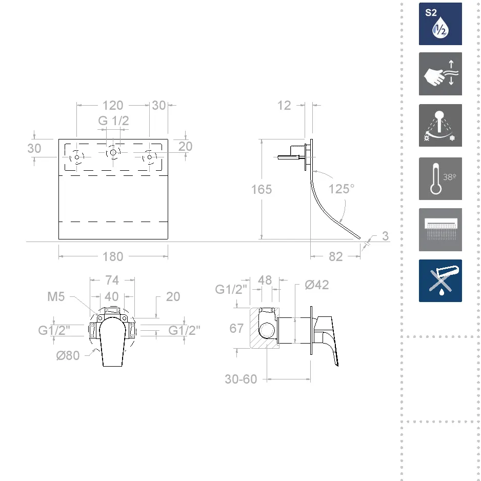 Смеситель оснащен керамическим картриджем Ø42 мм, который обеспечивает плавное изменение температуры воды. Это достигается за счет конструкции, которая защищает от ожогов и блокирует температуру на комфортном уровне 38°. Как результат, использование смесителя становится не только безопасным, но и удобным для всех членов семьи.