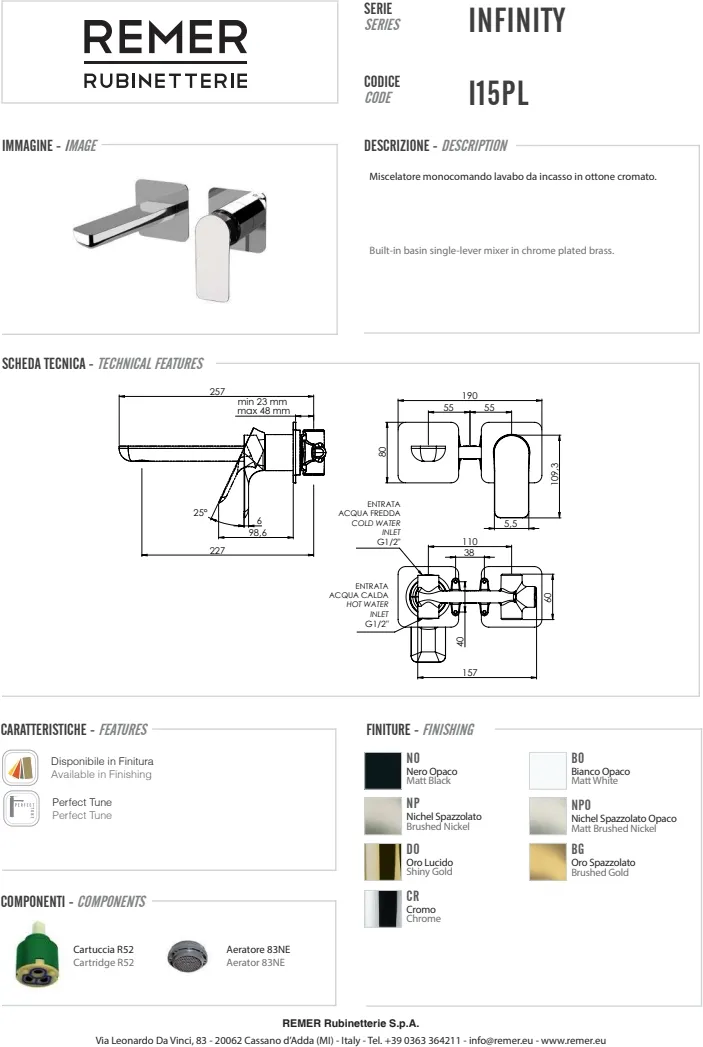 Смеситель для раковины Remer Infinity I15PL выполнен в современном стиле и станет отличным решением для вашей ванной комнаты. Данная модель предназначена для скрытого монтажа в умывальнике и изготовлена из высококачественной хромированной латуни, что гарантирует долговечность и стойкость к коррозии. Изделие оснащено удобным однорычажным управлением, которое обеспечивает легкость в использовании и точный контроль температуры воды. Излив длиной 227 мм имеет угловатую форму и фиксированное положение, что придает изделию уникальный стильный облик. Этот смеситель прекрасно подойдет для интерьеров в современном стиле. Глянцевая хромированная поверхность добавляет благородства и эстетики изделию, а наличие стандартной подводки 1/2" обеспечивает совместимость с различными видами сантехнических систем.