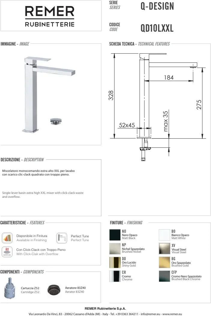 Представляем вашему вниманию однорычажный высокий смеситель для умывальника из коллекции Q-Design от бренда Remer. Этот стильный сантехнический элемент станет отличным дополнением вашей ванной комнаты, благодаря своему современному дизайну и хромированному покрытию. Смеситель оснащён донным клапаном системы "Click-Clack" с переливом, что делает его использование удобным и практичным. Продукт разработан на картридже диаметром 25 мм, а для встраиваемых душевых элементов используется картридж диаметром 35 мм. Форма изделия угловатая, что подчёркивает его современный стиль. Стационарный излив имеет высоту 275 мм и длину 184 мм, обеспечивая комфортное использование.