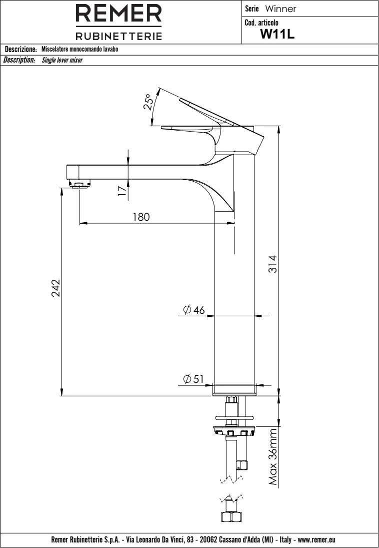 Представляем вам однорычажный высокий смеситель для раковины Remer из коллекции Winner. Этот стильный и современный смеситель выполнен из прочной латуни с глянцевой поверхностью, что обеспечивает долговечность и придаёт ванной комнате современный вид. Модель отличается фиксированным изливом длиной 180 мм, который удобно применять для раковин любого размера. Высота излива составляет 242 мм, что делает его идеальным для повседневного использования. Смеситель монтируется на раковину и отличается удобным рычажным управлением для лёгкой регулировки температуры и давления воды. Он предназначен для установки на одно монтажное отверстие. Стильный дизайн отлично впишется в современный интерьер ванной комнаты.