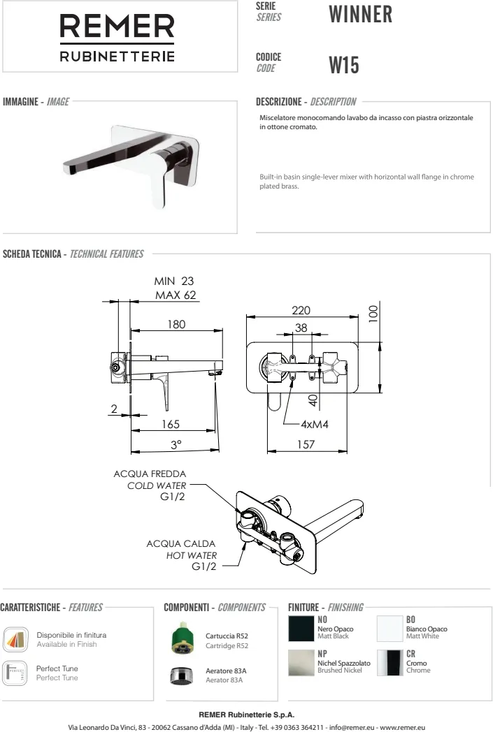 Откройте для себя изящный и современный смеситель для раковины Remer Winner W15, разработанный для тех, кто ценит стиль и функциональность. Этот однорычажный смеситель с встраиваемым монтажом идеально подходит для всех, кто хочет скрыть излишние элементы и подчеркнуть минимализм в интерьере. Изготовлен из прочной хромированной латуни, он имеет декоративный отражатель и фиксированный излив длиной 18 см, что обеспечивает удобство использования и долговечность. Отличный выбор для современных ванных комнат, предлагающий баланс между дизайном и практичностью.