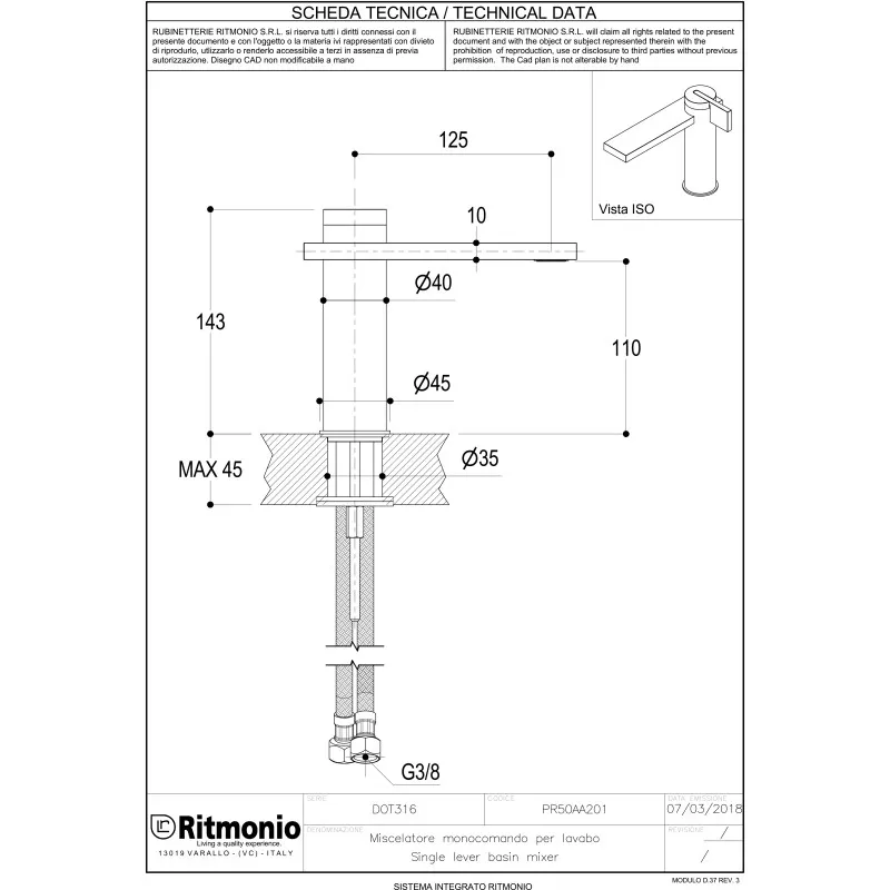 Дополнительные характеристики: вентильное управление, фиксированный излив, керамическая кран-букса, 1 отверстие для монтажа, гибкая подводка
