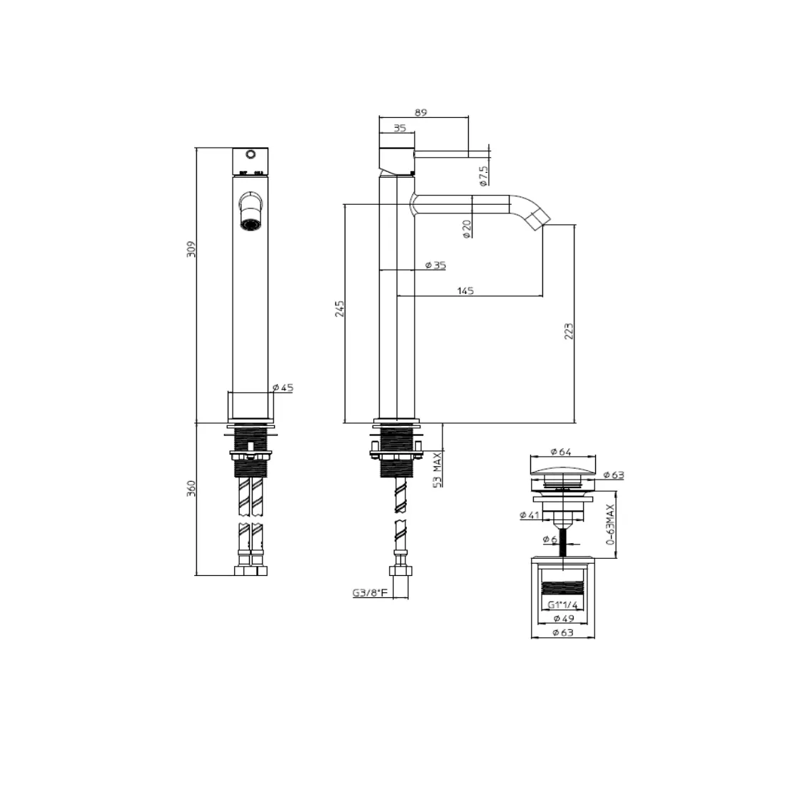 Смеситель высокий для раковины Bossini Teo T излив 14.5см с донным клапаном. гибкая подводка. хром
