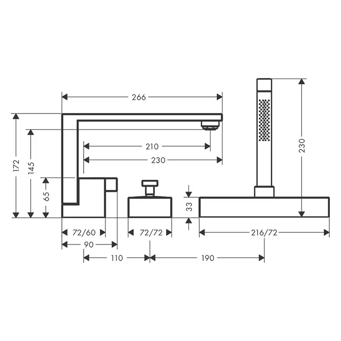 Axor Edge Смеситель на борт ванны, на 3 отв., с ручным душем, излив 210мм, алмазная огранка, цвет: з