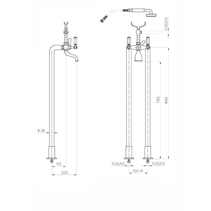 Bossini Liberty Смеситель для ванны, напольный, высота 890 мм, душ лейка Liberty шланг латунь, 150 с