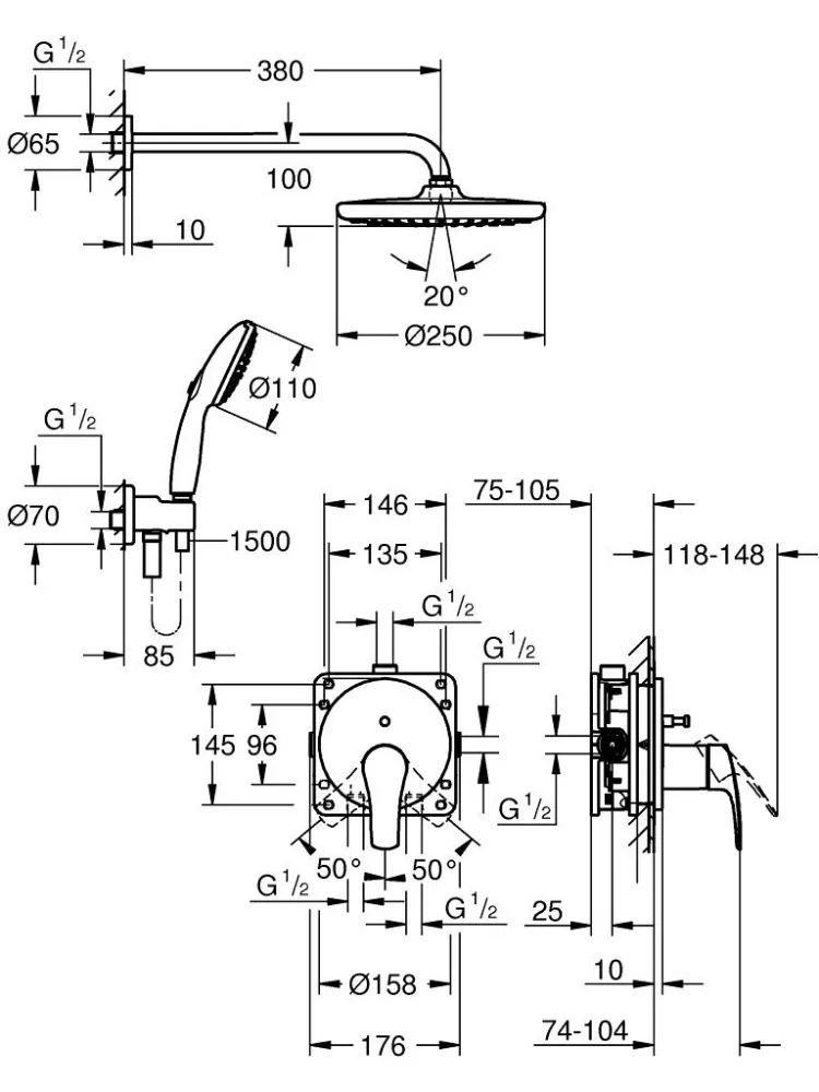 - Размер верхнего душа, мм: 250.0