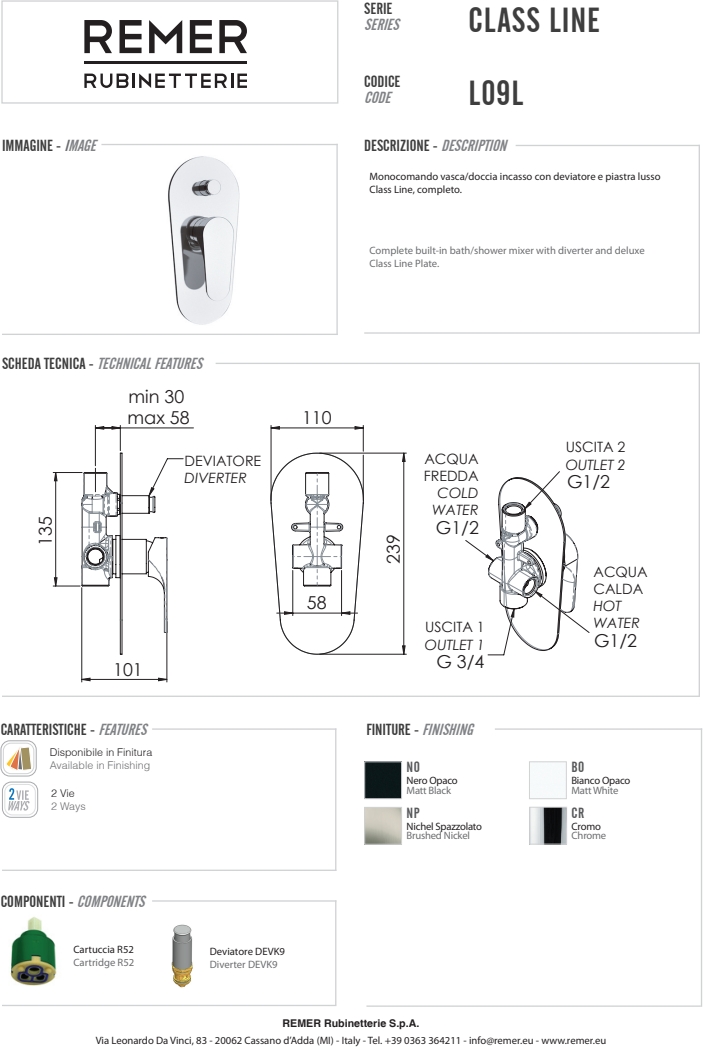 Смеситель состоит из внешней части и предназначен для управления душем. В случае необходимости, можно отдельно приобрести только встроенные (арт. N09B) или только внешние компоненты (арт. L09LE). Благодаря своему современному дизайну и качественным материалам, этот смеситель станет идеальным выбором для тех, кто ценит стиль и функциональность.