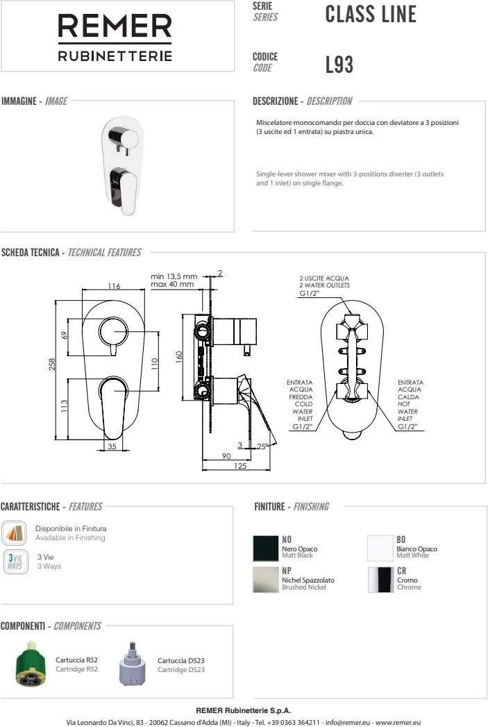 Смеситель для душа из коллекции Class Line от бренда Remer — это идеальное сочетание современного стиля и функциональности. Однорычажный смеситель предназначен для скрытого монтажа и оснащён переключателем потока, что обеспечивает удобное распределение потоков воды на три выхода и один вход. Изготовлен из высококачественной латуни, который гарантирует долгий срок службы и надёжность. Смеситель имеет глянцевую хромированную поверхность, придающую ему элегантный вид и легкость в уходе. Оснащение без излива делает его идеальным решением для душевых кабин.