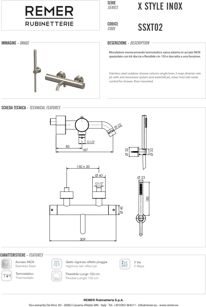 Познакомьтесь с элегантным и современным смесителем для ванны Remer из коллекции X-style. Этот однорычажный смеситель выполнен из матовой нержавеющей стали и станет стильным дополнением любой ванной комнаты. Он оснащен фиксированным изливом длиной 187 см, шлангом длиной 150 см, а также ручным душем с кронштейном. Удобная термостатическая система управления обеспечит комфортную температуру воды. Смеситель монтируется на стену и имеет стандарт подводки 1/2", что обеспечивает простую установку. С его современным дизайном и высоким качеством материала вы получите функциональность и стиль в одном изделии.