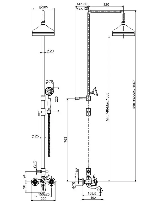 Смеситель для ванны с душевой стойкой, верхним и ручным душем, 22*19.2/32*h156.7,, бронза