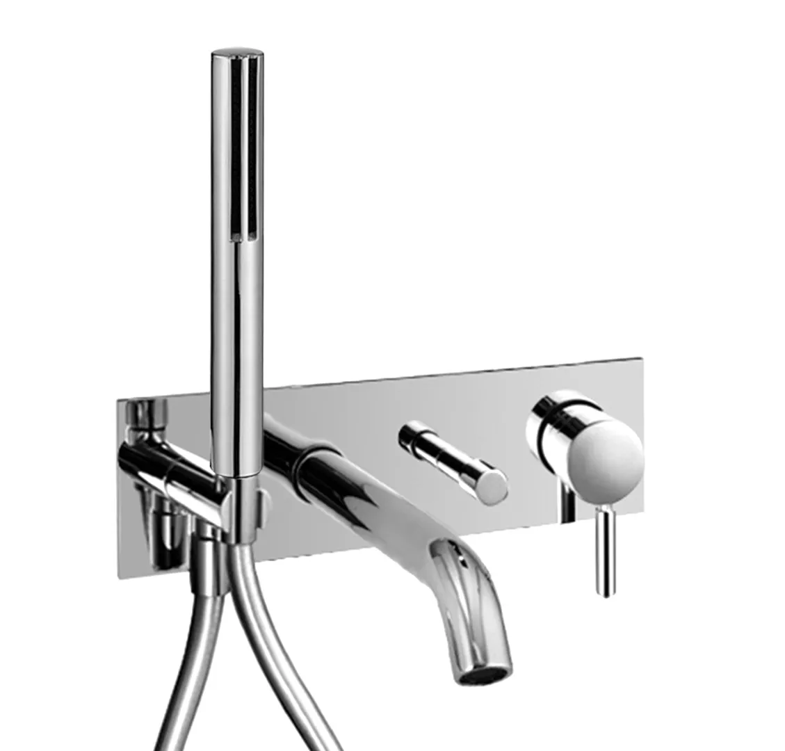 Fantini 5002E321B Встраиваемый смеситель для ванны вылет 20 см ручка автоматический переключатель на 2 потока ручная лейка SUN шланговое подсоединение с держателем для ручной лейки гибкий шланг 150 см ПВХ впуски 1/2" Звукоизолированные "Примечание: ручной душ FIT в отделках PVD и 93" Наружная часть Хром