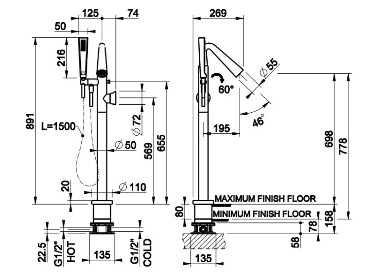 Смеситель для ванны Gessi 45028.707 Black Metal Brushed PVD