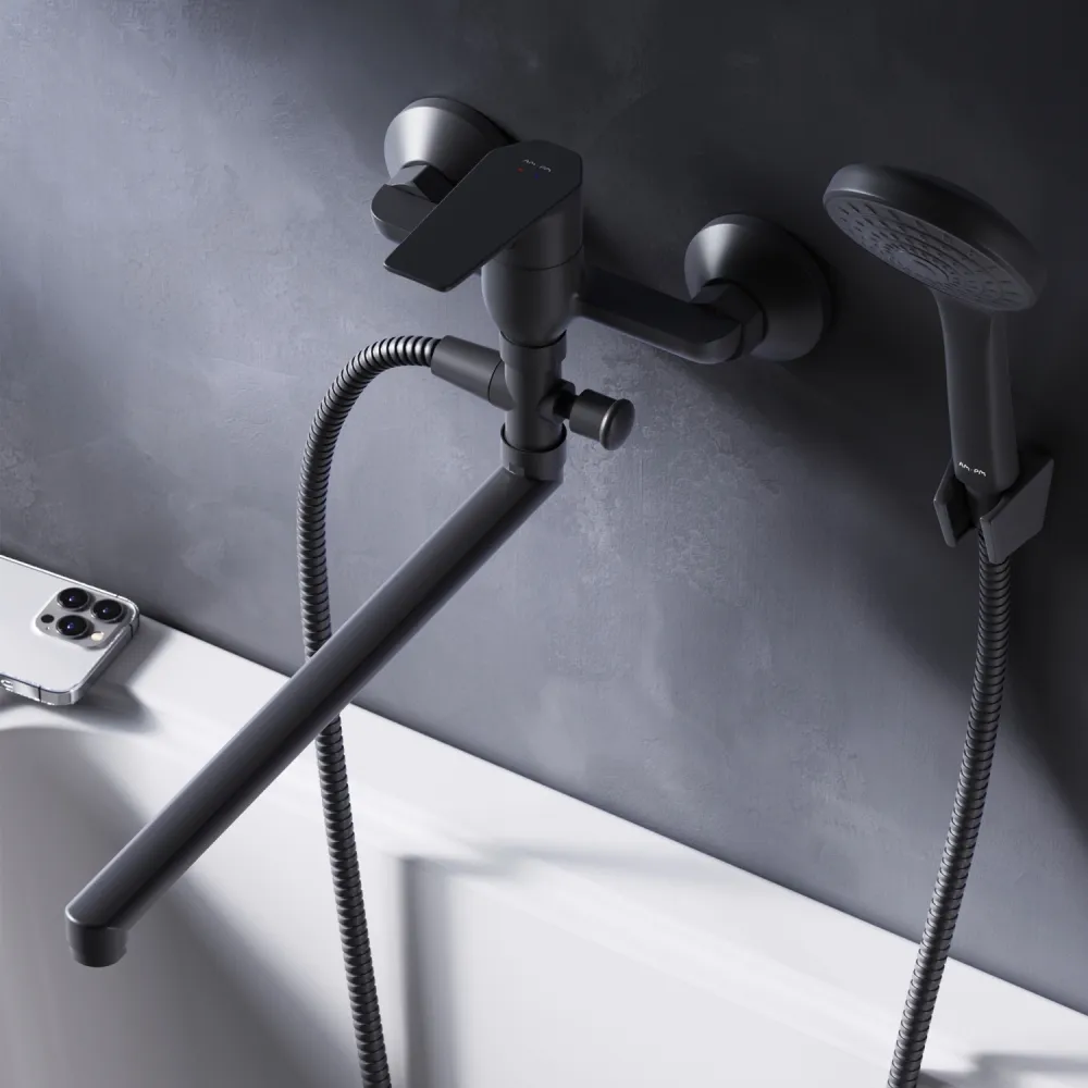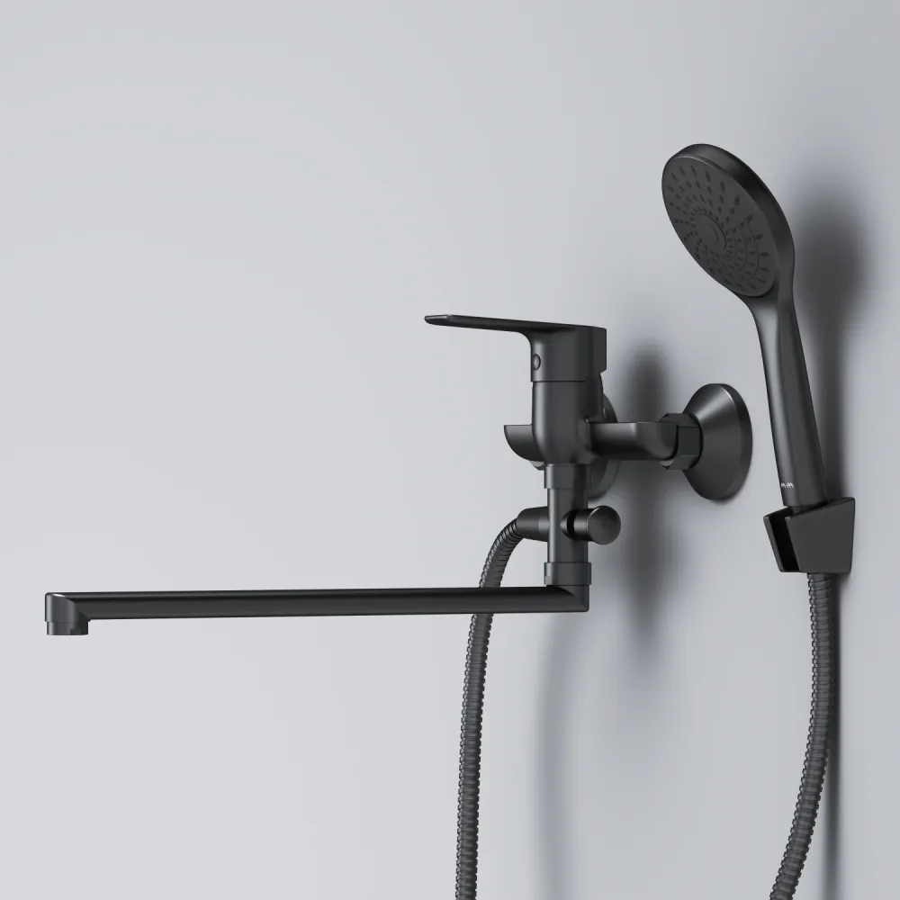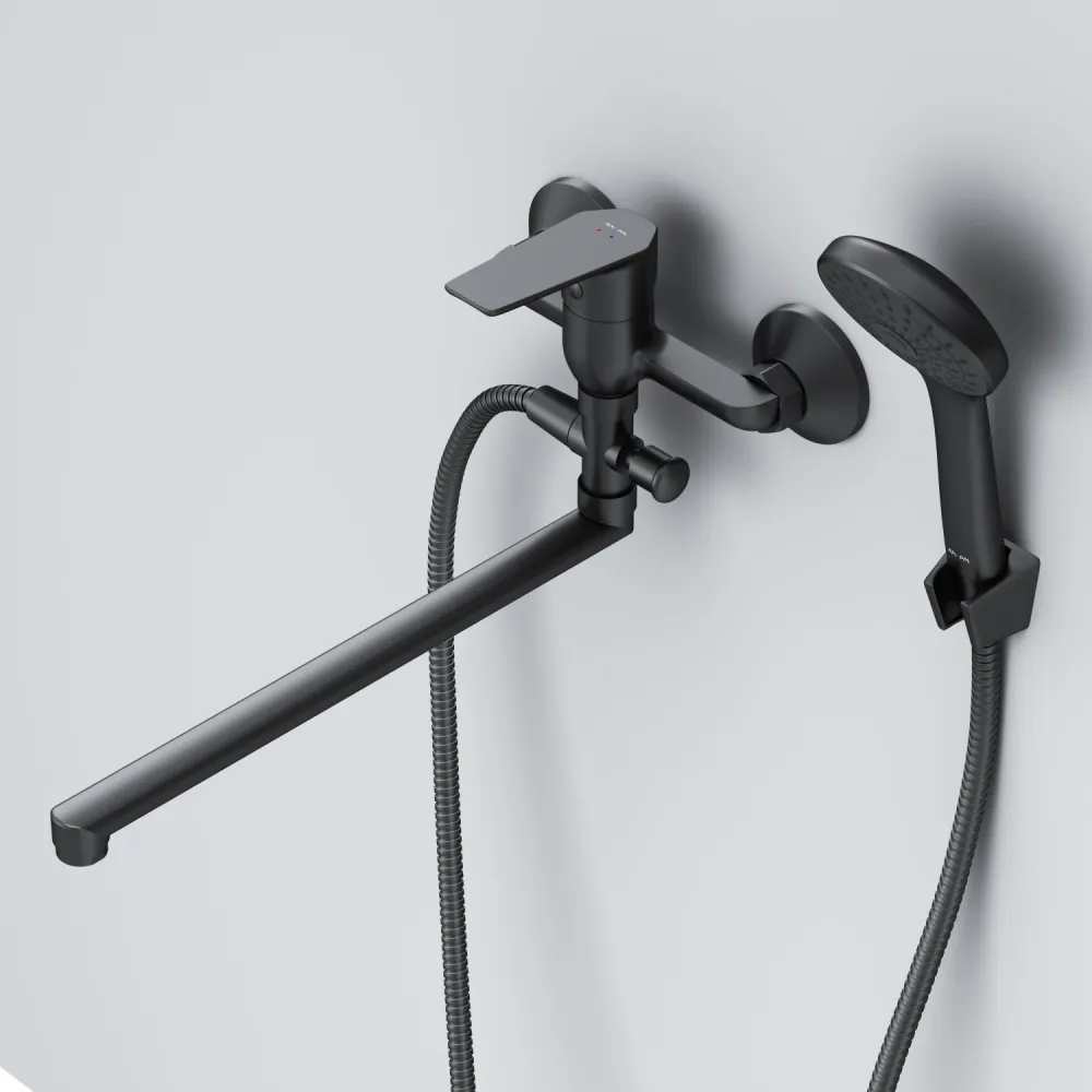Стильное универсальное решение для ванной комнаты - качественный смеситель для ванны и душа с длинным поворотным изливом с душевым набором.