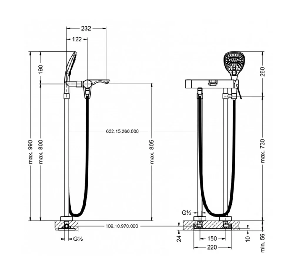 632.15.260.xxx | 2x Трубы ½“ вертикальные для подвода воды