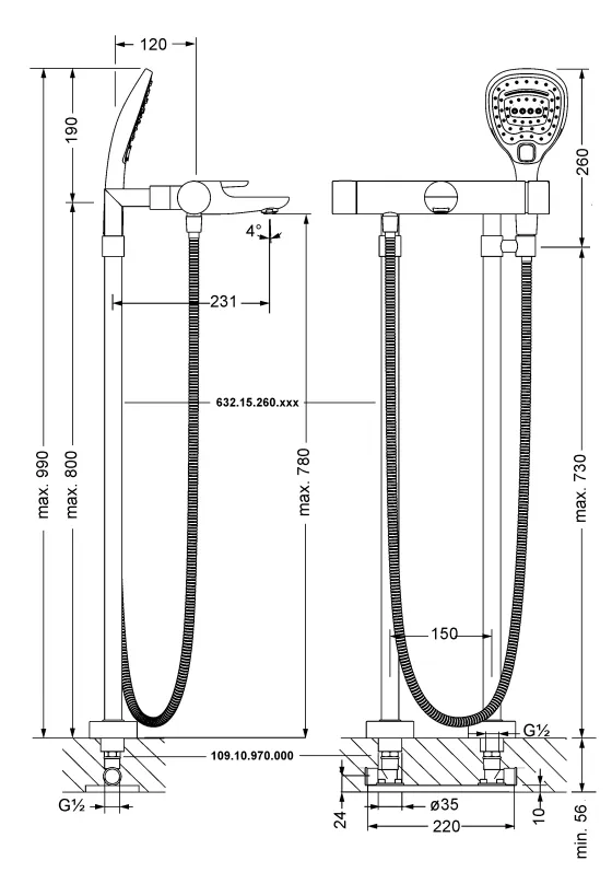 632.15.260.xxx | 2x Трубы ½“ вертикальные для подвода воды