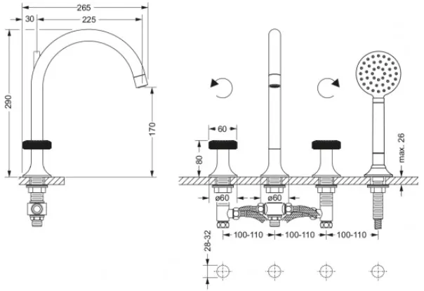 Набортный смеситель для ванны JORGER VALENCIA с двухрычажным управлением сочетает в себе классический дизайн и современные технологии. Включение системы очистки от извести и обратного клапана обеспечивает долговечность и бесперебойную работу устройства, предотвращая накопление отложений и защищая систему от обратного потока воды. Дополненный функциональной душевой лейкой, этот смеситель предлагает удобство и гибкость в использовании, позволяя легко переключаться между наполнением ванны и душем.