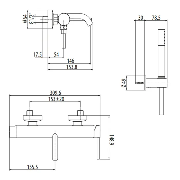 Смеситель для ванны настенный излив Gattoni Circle Two 146 ,с ручной лейкой на держателе, bianco opaco 9100/91BO