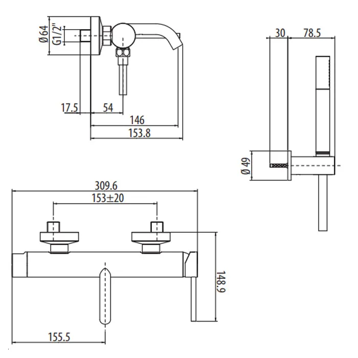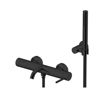 Смеситель для ванны настенный излив Gattoni Circle Two 146 ,с ручной лейкой на держателе, nero opaco 9100/91NO