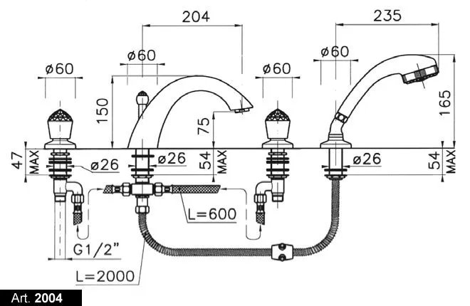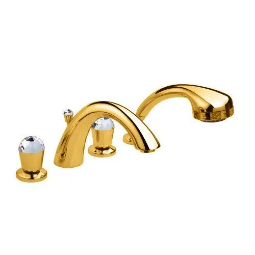 Смеситель для ванны Nicolazzi Cristallo на 3 отверстия, с переключателем, изливом 223мм и ручным душем, золото 2004GO22
